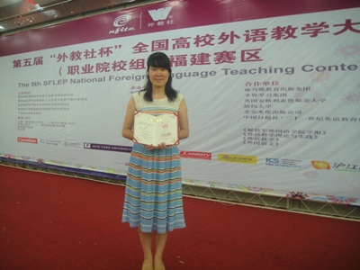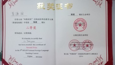 由教育部高等學(xué)校外國語言文學(xué)類專業(yè)教學(xué)指導(dǎo)委員會、教育部高等學(xué)校大學(xué)外語教學(xué)指導(dǎo)委員會、教育部職業(yè)院校外語類專業(yè)教學(xué)指導(dǎo)委員會和上海外語教育出版社主辦的“外教社杯”全國高校外語教學(xué)大賽(職業(yè)院校組)福建賽區(qū)復(fù)賽、決賽于2014年6月7日-8日在福建信息職業(yè)技術(shù)學(xué)院舉行。經(jīng)過初賽選拔,全省18所高職院校的英語教師參加復(fù)賽、決賽,我院英語教研室李源園老師經(jīng)過復(fù)賽授課(20分鐘)、決賽說課(10分鐘)兩個環(huán)節(jié)的激烈角逐,最終獲得二等獎。(公共基礎(chǔ)部)