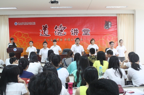 為了貫徹落實黨的十八大精神,加強(qiáng)社會主義核心價值體系建設(shè),提升師生的道德素質(zhì),促進(jìn)精神文明建設(shè),共建和諧校園,實現(xiàn)學(xué)生全面發(fā)展。公共基礎(chǔ)部于6月17日上午在行政樓六樓舉辦了以“引領(lǐng)道德新風(fēng)尚,傳遞青春正能量”主題的道德講堂活動。學(xué)院黨委書記林春明、黨委工作部董榕部長、系部熊美蘭主任、洪聿榮書記、部分教師以及全體同學(xué)參加了本次活動。