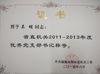 近日,接上級通知,我院護理系黨總支第二黨支部書記吳明同志被中共福建省委省直機關(guān)工委授予“2011-2013年度優(yōu)秀黨支部書記”稱號。特此喜報。