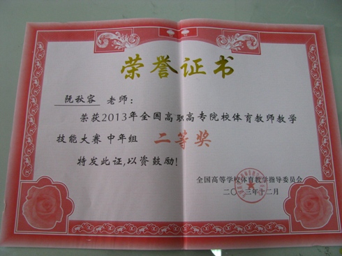 2013年 12月18日-22日在浙江經(jīng)濟(jì)職業(yè)技術(shù)學(xué)院舉行的“2013年全國高職高專院校體育教師技能大賽”中,我院公共基礎(chǔ)部阮秋容老師參加了中年組的角逐,取得了中年組二等獎(jiǎng)的好成績。