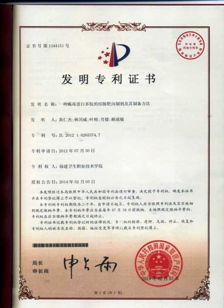 日前,由黃仁杰和林國威兩位老師領(lǐng)銜研發(fā)的科研成果“一種蝎毒蛋白多肽的結(jié)腸靶向制劑及其制備方法”喜獲國家知識(shí)產(chǎn)權(quán)局頒發(fā)的國家發(fā)明專利證書(專利號(hào):ZL 201210265374.7),授權(quán)公告日為:2014年2月5日。
