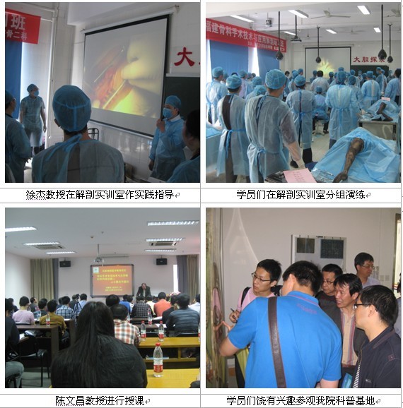 當天上午,培訓班在省立醫(yī)院舉行了簡短而熱烈的開班儀式,學院廖偉堅副院長、省立醫(yī)院繼續(xù)教育科王濤科長、省立醫(yī)院骨二科徐杰主任參加了開班儀式并分別講話。開班式后,蘭寶金、林院、陳文昌、施能木、徐杰等教授分別作了題為“髖關節(jié)生理及解剖結構”、“THA手術指征,假體選擇、模塊測量”、“髖關節(jié)置換圍手術期處理、全髖關節(jié)置換的并發(fā)癥處理”、“手術顯露與關閉傷口”和“髖臼側處理的原則和技巧、股骨側處理的原則和技巧及DDH伴OA的手術策略和總結”等內容的講座,還安排進行病歷交流與討論,充分體現(xiàn)了基礎醫(yī)學與臨床醫(yī)學的接軌,理論與實踐的結合。中午,為了能多些實踐時間,學員和工作人員一行約50余人放棄午休時間,提前抵達我院。首先在解剖實訓室由徐杰教授作髖關節(jié)手術示范后,學員們分六組進行手術操作實踐。最后全體學員還參觀了我院省級科普實踐基地。學員們對我院省級科普實踐基地建設成果贊賞不已,在很多標本前駐足細看揣摩并拍照留影。