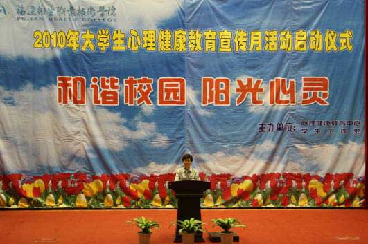 院黨委書記嚴(yán)肅、副院長魏立娜、各系部總支書記、全體輔導(dǎo)員以及各系的學(xué)生代表400多人參加啟動儀式,啟動儀式還邀請了福建師范大學(xué)心理健康指導(dǎo)中心主任、博士生導(dǎo)師程利國教授。啟動儀式由公共基礎(chǔ)部副主任、學(xué)院心理健康教育中心主任陳新主持。