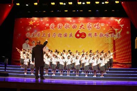 9月15日下午,省衛(wèi)生廳舉辦的迎國慶60周年“愛國歌曲大家唱”歌詠比賽在福州大戲院隆重舉行,來自衛(wèi)生系統(tǒng)的17個(gè)參賽隊(duì)伍以飽滿的熱情,演唱了《歌唱祖國》、《保衛(wèi)黃河》、《天路》、《在太行山上》等膾炙人口的愛國經(jīng)典歌曲,唱響了中華人民共和國成立60周年的光輝歷程和改革開放的輝煌巨變,醫(yī)務(wù)工作者們以歌聲表達(dá)了愛國情懷,展示了推進(jìn)衛(wèi)生事業(yè)發(fā)展、服務(wù)海峽西岸經(jīng)濟(jì)區(qū)建設(shè)的堅(jiān)定信念。