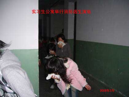 根據(jù)教育廳學校安全辦公室頒發(fā)的《關(guān)于認真做好春季開學初學校安全工作的通知》和轉(zhuǎn)發(fā)福建省人民政府安全生產(chǎn)委員會辦公室《關(guān)于認真汲取近期火災事故教訓進一步加強冬季防火工作的通知》以及國務院安全生產(chǎn)委員會辦公室的文件精神。在學院領導高度重視下,2009年3月3日與10日由保衛(wèi)處牽頭,在輔導員和公寓管理員的協(xié)助下,組織西洪、麥園兩處實習生住宿點舉行兩場消防逃生演練和滅火器使用現(xiàn)場講解活動。逃生演練過程以實戰(zhàn)出發(fā),模擬白天和夜間(斷電)情況下發(fā)生火災,學生如何按照指定線路快速逃生,并強調(diào)逃生時一定切記攜帶濕毛巾用其捂住嘴巴并彎腰跑步快速離開火場,確保安全;同時還現(xiàn)場詳細講解滅火器的使用方法和逃生演練過程存在問題及注意事項。共有300多人參加演練。通過模擬演練提高了學生的自我保護和安全防范意識,達到了預期的目的。