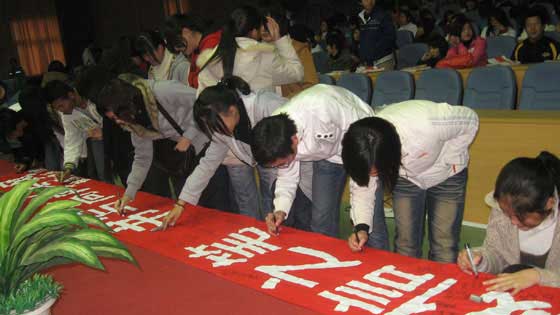 洪書(shū)記首先在會(huì)上強(qiáng)調(diào)了誠(chéng)信對(duì)一個(gè)人的重要性,號(hào)召大家在期末考試中應(yīng)認(rèn)真對(duì)待,杜絕考試舞弊的行為。然后,2名學(xué)生代表發(fā)言,闡述對(duì)嚴(yán)肅考風(fēng)考紀(jì),端正學(xué)習(xí)態(tài)度的認(rèn)識(shí)。緊接著,全體同學(xué)在徐向前同學(xué)帶領(lǐng)下右手握拳,莊重宣誓。最后,由馬主任結(jié)合我院的校訓(xùn)暢談了誠(chéng)信對(duì)于當(dāng)代大學(xué)生的重要性并作出總結(jié)。會(huì)議結(jié)束后進(jìn)行“手握誠(chéng)信之筆,書(shū)寫(xiě)高尚考風(fēng)”的簽字活動(dòng)。