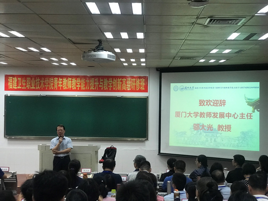 8月20日上午,福建衛(wèi)生職業(yè)技術(shù)學(xué)院2019年暑期教師教學(xué)能力提升與教學(xué)創(chuàng)新高級研修班在廈門大學(xué)國家級教師教學(xué)發(fā)展示范中心舉辦開班儀式。本次研修是2019年我院繼黨校第十二期暑期干部研討班之后舉辦的第二個暑期培訓(xùn)班,廈門大學(xué)原副校長、國家級教師發(fā)展示范中心主任鄔大光教授,我院黨委書記曾武祈、紀(jì)委書記游峰、副院長陳貞健、副院長黃銘珊和副院長鄭翠紅等院領(lǐng)導(dǎo)出席了開班儀式。來自學(xué)院專業(yè)帶頭人、教研室主任(含實訓(xùn)中心主任)、骨干教師、青年教師和新進教師120多人,齊聚一堂共同參加了本次研修班的開班儀式。