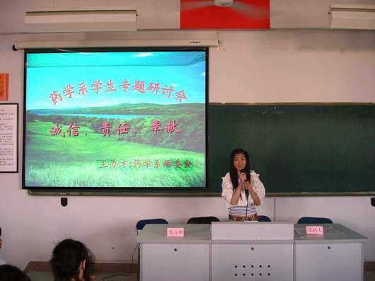 藥學(xué)系于4月8日下午在系部第一階梯教室舉行題為“誠(chéng)信、責(zé)任、奉獻(xiàn)”的學(xué)生專(zhuān)題研討會(huì)。擔(dān)任本次研討會(huì)的評(píng)委老師有黨總支歐春木書(shū)記、公共基礎(chǔ)部陳潔、洪斯汶、黃海云、施漢生老師以及各班輔導(dǎo)員,研討會(huì)由04藥學(xué)502班的廖微主持。