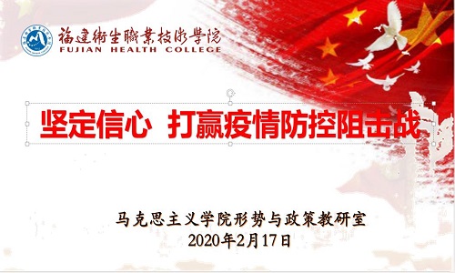 “萬眾一心,沒有翻不過的山;心手相牽,沒有跨不過的坎。堅定信心,打贏疫情防控阻擊戰(zhàn)!”“秉承校訓(xùn),大醫(yī)精誠,未來可期,白衣燕帽綻芳華”。這是每天坐鎮(zhèn)校園疫情防控一線指揮的福建衛(wèi)生職業(yè)技術(shù)學(xué)院黨委書記曾武祈,百忙中對衛(wèi)院學(xué)子們提出的殷切寄語。馬院老師們擔負著鑄魂育人的重任,他們已蓄滿熱情,全力以赴地完成好這場關(guān)于生命和信念的教育。