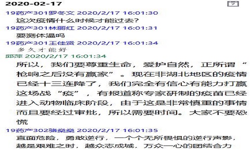 特殊時期的思政課堂上,馬院教師們通過語音溝通、線上答疑、轉(zhuǎn)發(fā)防控知識等方式,積極向?qū)W生科普預(yù)防新型冠狀病毒的相關(guān)知識,以馬克思主義哲學(xué)思維,引導(dǎo)學(xué)生樹立科學(xué)觀念,不聽謠、不信謠、不傳謠,并通過解讀習近平總書記關(guān)于新型黃莊肺炎疫情防控的重要講話精神以及政府出臺的各項措施,引導(dǎo)學(xué)生認識社會主義制度的優(yōu)越性,營造良好充滿正能量的輿論氛圍,從而堅定打贏疫情防控阻擊戰(zhàn)的信心。