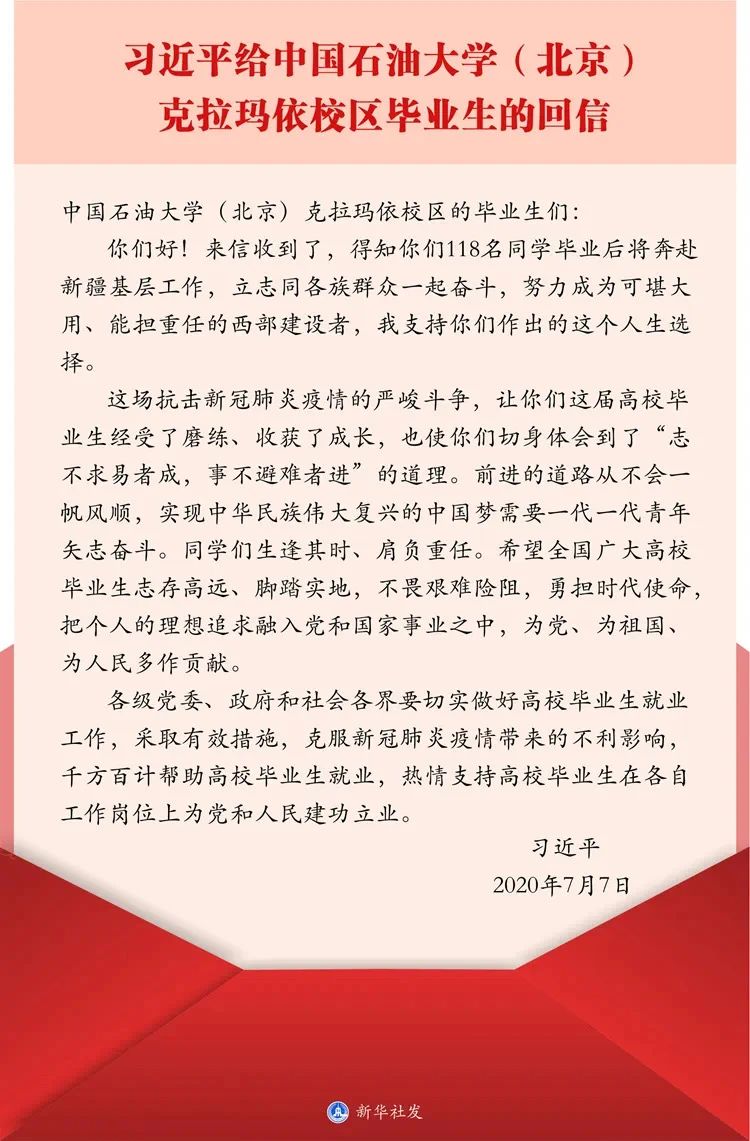 中共中央總書記、國家主席、中央軍委主席習(xí)近平7月7日給中國石油大學(xué)(北京)克拉瑪依校區(qū)畢業(yè)生回信,肯定他們到邊疆基層工作的選擇,同時(shí)對(duì)廣大高校畢業(yè)生提出了殷切期望?;匦艃?nèi)容如下: