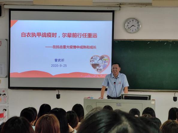 9月,福建衛(wèi)生職業(yè)技術學院黨委書記曾武祈、黨委副書記李美華、紀委書記游鋒、副院長陳貞健、副院長黃銘珊等院領導以“白衣執(zhí)甲戰(zhàn)疫時,爾輩前行任重遠”、“戰(zhàn)‘疫',我們在一起!”為主題紛紛走上講臺,以學生喜聞樂見、愛聽想聽的內容以及風趣幽默、感人肺腑的語言,為大二學生上了一堂既生動活潑又充滿正能量的開學第一課,用抗疫精神滋養(yǎng)心靈,用英雄豐碑感召時代,在衛(wèi)院學子心中點亮一盞明燈,照亮征途、指引方向。
