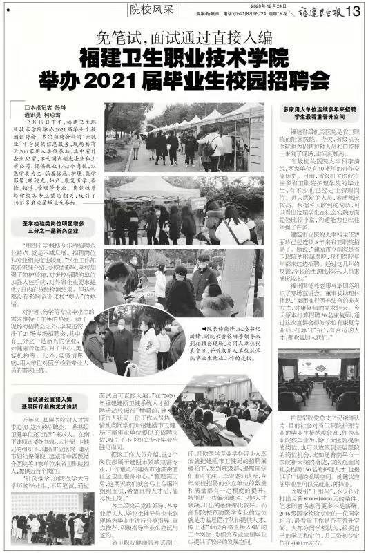 【福建衛(wèi)生報(bào)、閩侯電視臺(tái)】報(bào)道我校舉辦2021屆畢業(yè)生校園招聘會(huì)