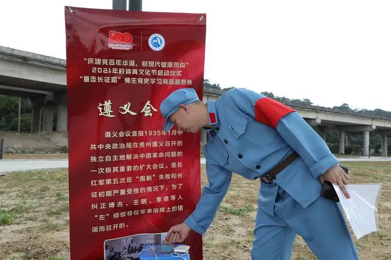 這次比賽設(shè)置了43個(gè)打卡點(diǎn),其中大型的打卡點(diǎn)分別以“湘江”、“赤水”、“金沙江”、“瀘定橋”、“岷山”等紅軍長征中的重大歷史事件發(fā)生地貫穿,將紅色文化、紅色精神融入到越野賽的全過程,讓師生身臨其境地走進(jìn)黨史,觸摸黨史。