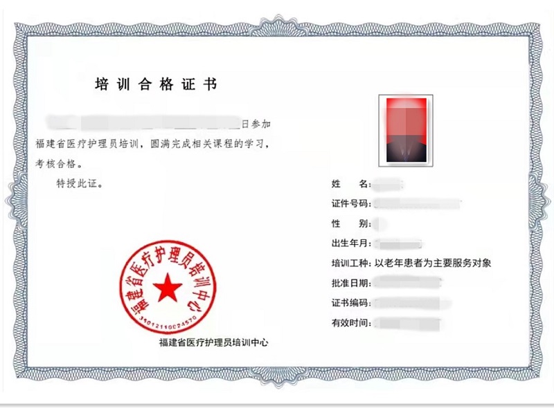 福建省醫(yī)療護理員培訓合格證書樣圖