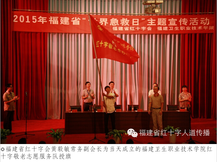 9月12日是第16個(gè)“世界急救日”,今年的主題是“急救與老齡化人群”。上午,由福建省紅十字會主辦、福建衛(wèi)生職業(yè)技術(shù)學(xué)院紅十字會承辦的“2015年‘世界急救日’系列活動(dòng)啟動(dòng)暨福建衛(wèi)生職業(yè)技術(shù)學(xué)院紅十字敬老志愿服務(wù)隊(duì)成立儀式”在福建衛(wèi)生職業(yè)技術(shù)學(xué)院學(xué)術(shù)廳舉行,福建省紅十字會黨組書記、常務(wù)副會長黃毅敏,省紅十字會副秘書長蔡康政,福建衛(wèi)生職業(yè)技術(shù)學(xué)院黨委書記、紅十字會會長林春明,衛(wèi)生職業(yè)技術(shù)學(xué)院紅十字會秘書長宋維出席活動(dòng)儀式。