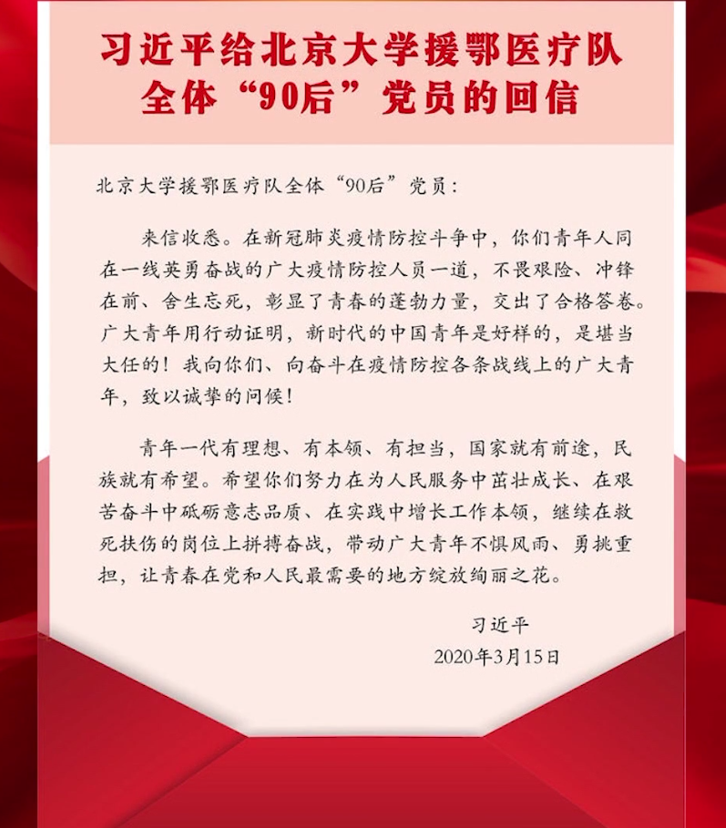 3月15日,習(xí)近平總書(shū)記給北京大學(xué)援鄂醫(yī)療隊(duì)全體“90后”黨員回信,向他們和奮斗在疫情防控各條戰(zhàn)線上的廣大青年致以誠(chéng)摯的問(wèn)候??倳?shū)記在回信中表示,在新冠肺炎疫情防控斗爭(zhēng)中,青年人同在一線英勇奮戰(zhàn)的廣大疫情防控人員一道,不畏艱險(xiǎn)、沖鋒在前、舍生忘死,彰顯了青春的蓬勃力量,交出了合格答卷。廣大青年用行動(dòng)證明,新時(shí)代的中國(guó)青年是好樣的,是堪當(dāng)大任的!【回信全文】