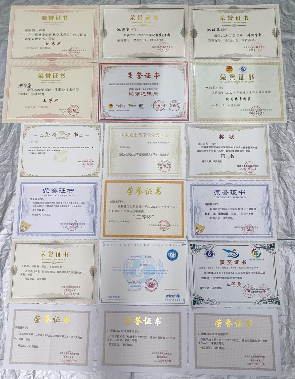 課業(yè)之余,池麗鑾還積極參與到豐富多彩的校園生活中。她在校園生活里默默的耕耘,也獲得了許多的收獲:福建省高職高專院?!扒啻合螯h 強(qiáng)國(guó)有我”黨史知識(shí)競(jìng)賽二等獎(jiǎng)、艾滋病防控宣傳教育系列活動(dòng)之創(chuàng)意防艾宣傳片大賽一等獎(jiǎng)、“憶百十年芳華校史,話心中美麗閩衛(wèi)”藝術(shù)類手工藝品一等獎(jiǎng)、第八屆“互聯(lián)網(wǎng)+”大學(xué)生創(chuàng)新創(chuàng)業(yè)大賽校二等獎(jiǎng)、第十六屆“挑戰(zhàn)杯”福建省大學(xué)生課外學(xué)術(shù)科技作品競(jìng)賽校賽一等獎(jiǎng)…… 一張張的獎(jiǎng)狀看起來(lái)如此耀眼,但是獎(jiǎng)狀的背后是一次次失敗的經(jīng)驗(yàn)疊加與累積,池麗鑾說(shuō):“青春允許犯錯(cuò)誤,只要學(xué)會(huì)提高自我,就能在失敗中走向一個(gè)又一個(gè)成功?!?/p>