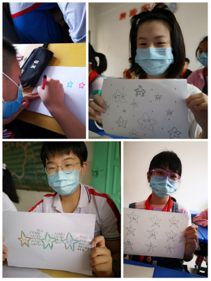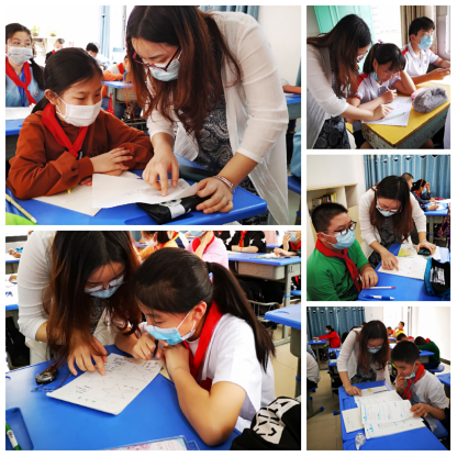 為了更好地跟學(xué)生互動,余彩云老師與鄭梅欽老師分工合作,一個專心在線講授,一個線下關(guān)注學(xué)生的現(xiàn)場表現(xiàn),根據(jù)學(xué)生的情況進(jìn)行有針對性地指導(dǎo)。輕松的游戲互動和親切的教學(xué)模式讓學(xué)生耳目一新,快樂參與其中,表達(dá)了自己返校復(fù)學(xué)的五彩心情。