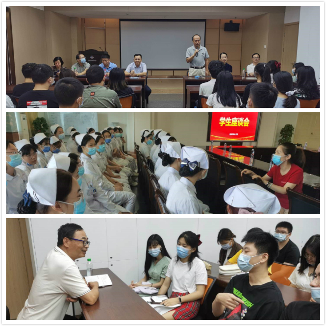 學(xué)生座談會(huì)中,與會(huì)領(lǐng)導(dǎo)詳細(xì)了解學(xué)生的實(shí)習(xí)情況與心得體會(huì),并認(rèn)真聽取了學(xué)生對(duì)實(shí)習(xí)教學(xué)與管理的各方面建議。許能鋒勉勵(lì)同學(xué)們要積極主動(dòng)融入實(shí)習(xí)崗位和實(shí)習(xí)環(huán)境,珍惜臨床頂崗實(shí)習(xí)機(jī)會(huì),牢牢把握好實(shí)踐教學(xué)這一重要階段,強(qiáng)化臨床思維和人文情懷,提升臨床實(shí)踐、醫(yī)患溝通等方面的能力和素養(yǎng),為以后真正走上醫(yī)護(hù)崗位打下堅(jiān)實(shí)基礎(chǔ)。曾武祈特別強(qiáng)調(diào)了實(shí)習(xí)期的安全問(wèn)題,希望同學(xué)們要有高度的安全意識(shí),注意人身安全、醫(yī)療安全、財(cái)產(chǎn)安全、交通安全、防疫安全等,確保實(shí)習(xí)期間既學(xué)有所成又愉快順利。隨后,實(shí)習(xí)生分小組與各系主任進(jìn)行深入交流。