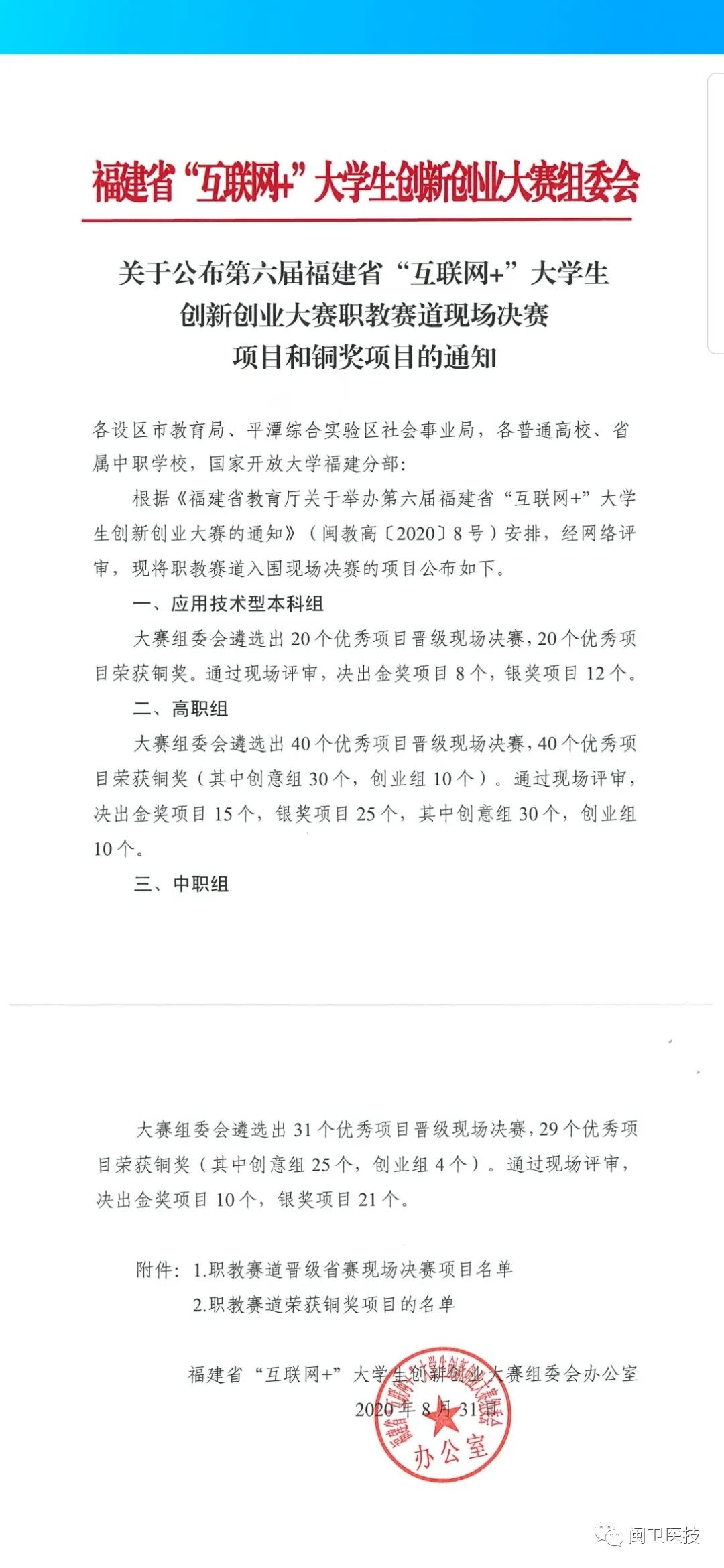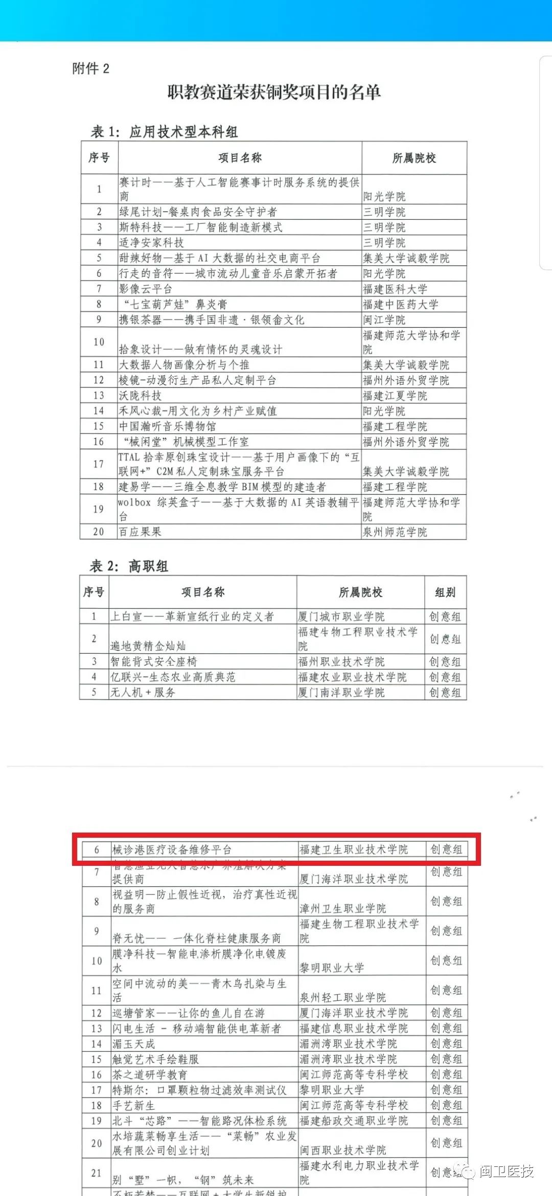 2020年8月31日,第六屆福建省“互聯(lián)網(wǎng)+”大學生創(chuàng)新創(chuàng)業(yè)大賽職教賽道暨第四屆黃炎培海峽職業(yè)教育創(chuàng)新創(chuàng)業(yè)大賽省級初賽網(wǎng)評結果公布,我院《械診港醫(yī)療設備維修平臺》項目榮獲省級銅獎。該項目由醫(yī)學技術系18影像303班林詩婷、19檢驗301班邱倩玉、17設備301班盧敏、17設備301班鐘林玉、19設備301班劉紫嫻、18影像303班朱麗敏、17投資學謝同心(師大協(xié)和學院)等七位同學共同,醫(yī)學技術系鐘偉雄老師主要指導。