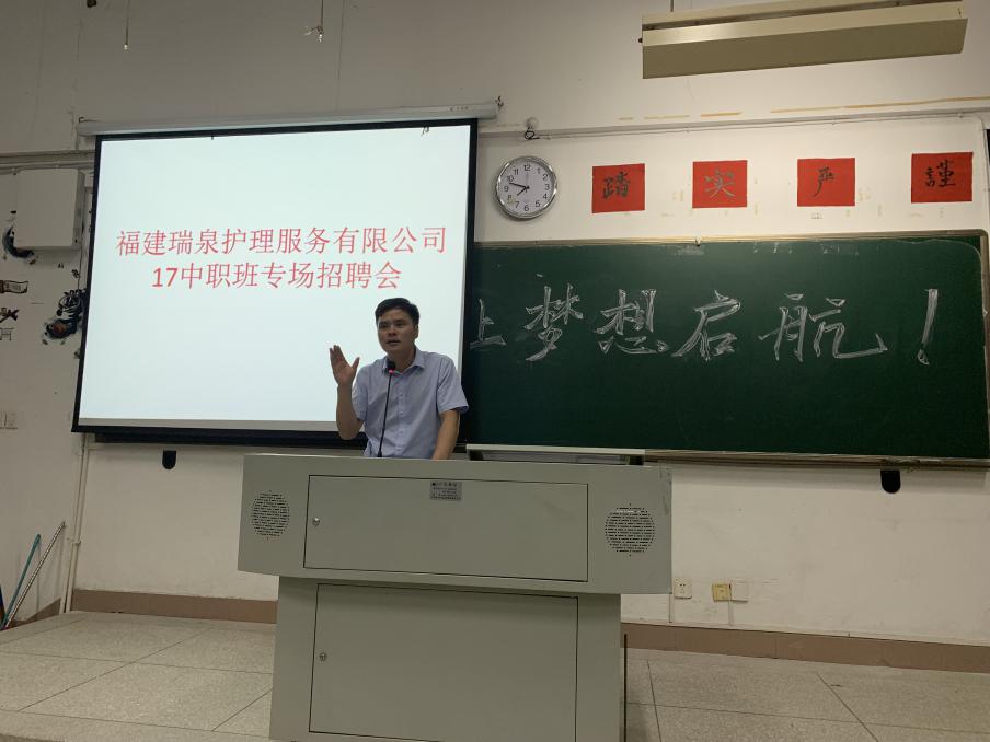 福建省瑞泉護(hù)理服務(wù)有限公司作為精準(zhǔn)扶貧校企合作方之一,三年來也一直關(guān)注著精準(zhǔn)扶貧班學(xué)生的成長,在本次培訓(xùn)中,瑞泉公司也派專員來到班級(jí),為學(xué)生們提供就業(yè)指導(dǎo),提供就業(yè)兜底保障。