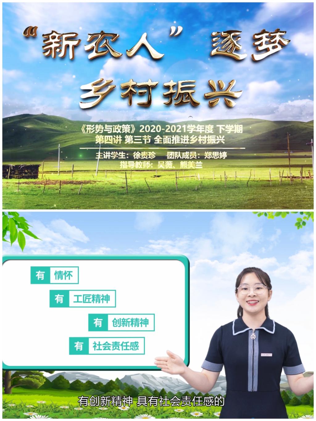 徐貴珍、鄭思婷同學(xué)的參賽作品《“新農(nóng)人”逐夢(mèng)鄉(xiāng)村振興》(指導(dǎo)老師:吳薇、熊美蘭),榮獲“百年輝煌路·奮斗正當(dāng)時(shí)”第五屆全省高校大學(xué)生講思政課公開課展示活動(dòng)優(yōu)秀獎(jiǎng)。