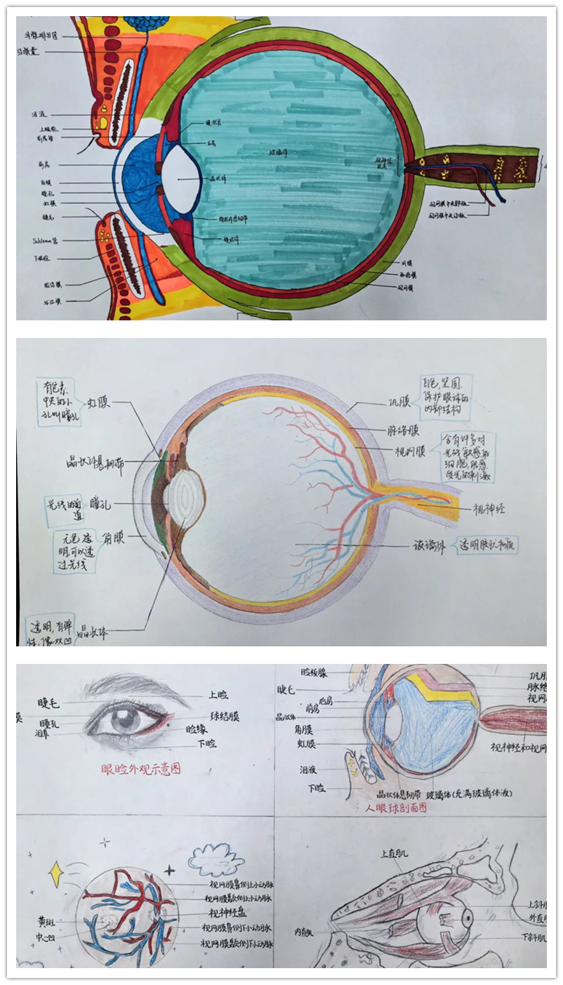 眼睛是心靈的窗戶,它有多美呢?眼球繪畫大賽的參賽選手們用細(xì)膩的筆觸、豐富的色彩,呈現(xiàn)出了一幅幅生動的眼球解剖圖。那是眼視光學(xué)子對專業(yè)的熱愛,也充分展示了同學(xué)們感受美、欣賞美、表現(xiàn)美和創(chuàng)造美的能力。