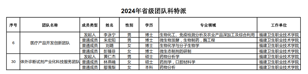 近日,福建省科技特派員選認結果公布,學校黃仁杰、李泳寧、鄧元榮、黃建凡、林勇、張麗華6名教師獲選2024年省級個人科技特派員;黃仁杰等3名教師組成的“體外診斷試劑產業(yè)化科技服務”團隊和李泳寧等4名教師組成的“醫(yī)療產品開發(fā)創(chuàng)新”團隊獲選省級團隊科技特派員。學校省級團隊科技特派員選認實現新的突破。
