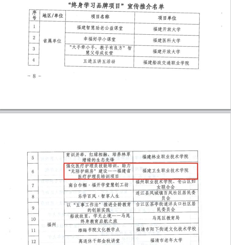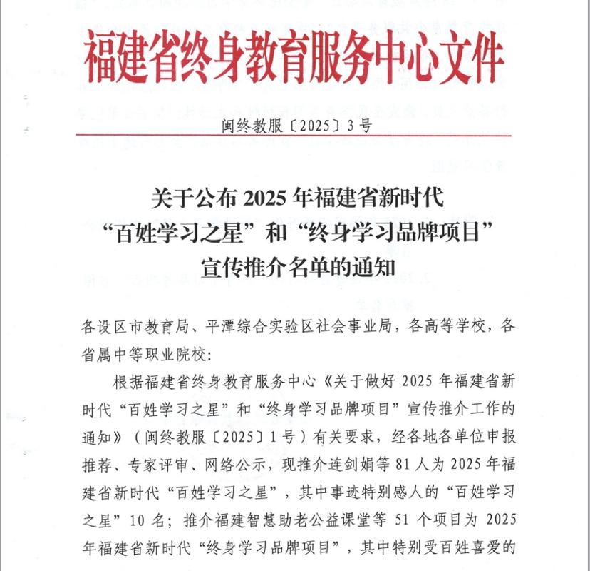 近日,福建省終身教育促進委員會公布2025年“百姓學(xué)習(xí)之星”和“終身學(xué)習(xí)品牌項目”推介名單。我校護理學(xué)院連劍娟老師、藥學(xué)院林玲老師入選“百姓學(xué)習(xí)之星”,其中連劍娟老師更是躋身全省10位事跡特別感人的“百姓學(xué)習(xí)之星”行列。繼續(xù)教育學(xué)院和護理學(xué)院聯(lián)合申報的《強化醫(yī)療護理員技能培訓(xùn),助力“無陪護病房”建設(shè)——福建省醫(yī)療護理員培訓(xùn)項目》入選“終身學(xué)習(xí)品牌項目”。