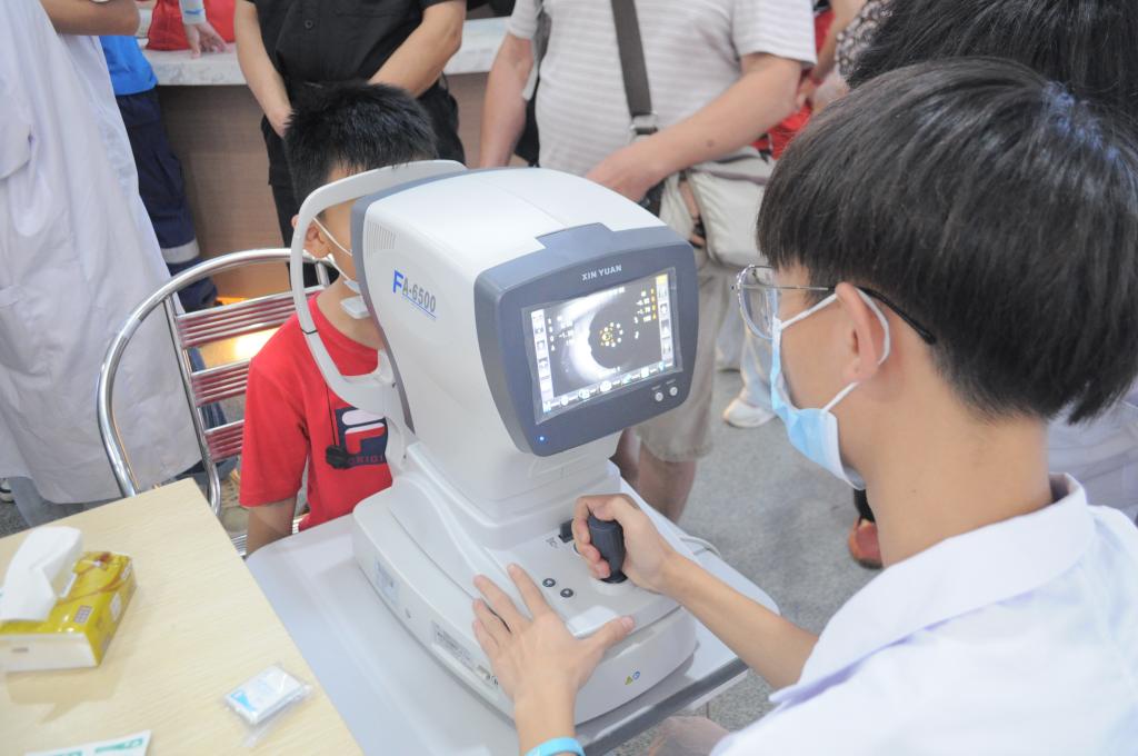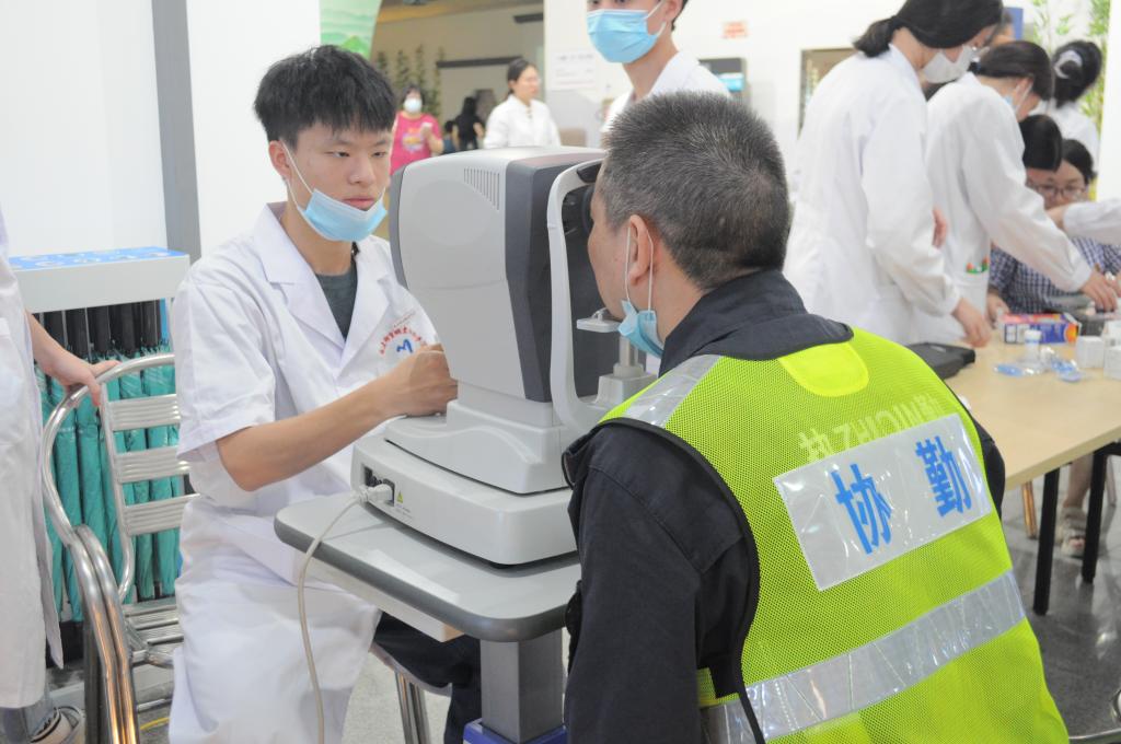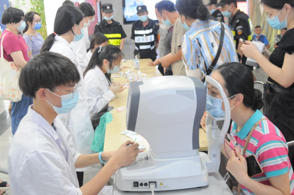 宣傳科學(xué)用眼,共享“睛”彩。眼視光技術(shù)專業(yè)師生由黨員教師張敏華帶隊,在義診現(xiàn)場用專業(yè)儀器為群眾開展驗光檢查。師生們?yōu)槿罕娂?xì)心解讀驗光檢測結(jié)果,耐心講解愛眼護(hù)眼的方法,引導(dǎo)特殊情況及時就醫(yī)。