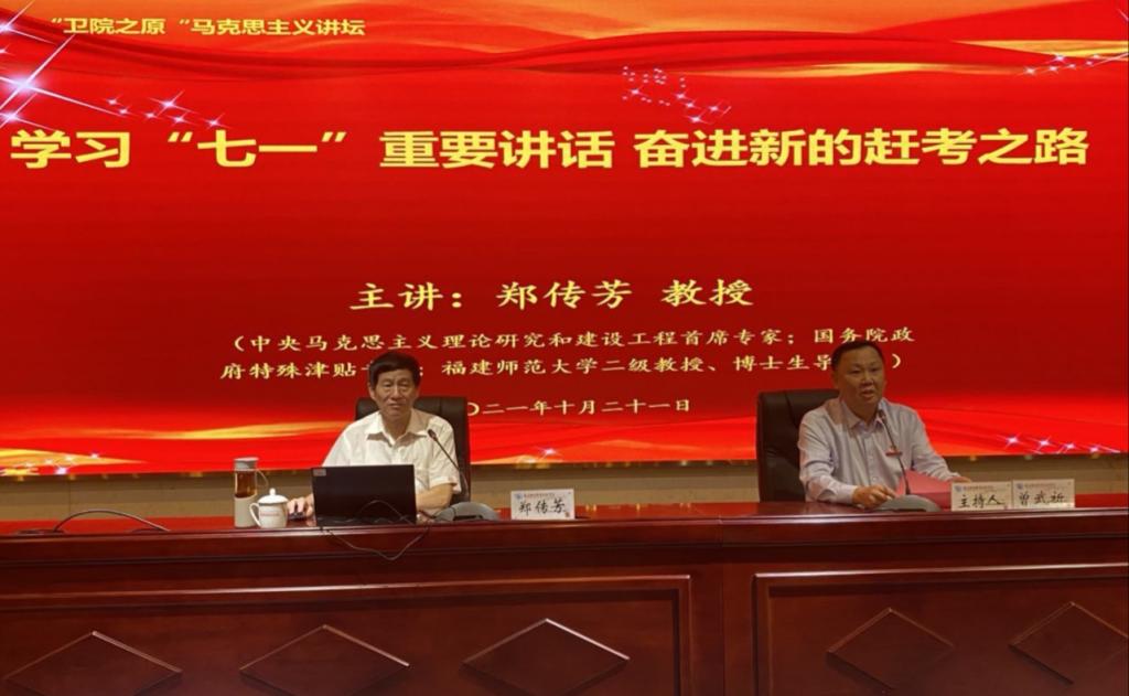 為深入學習宣傳貫徹“七一”重要講話精神,持續(xù)推進黨史學習教育走深走實,我校特邀中央馬克思主義理論硏究和建設工程首席專家、福建師范大學鄭傳芳教授作題為《學習“七一”重要講話 奮進新的趕考之路》的專題講座。講座由校黨委書記曾武祈主持,校領導、中層干部、思政課教師、校園網絡文化五支隊伍和醫(yī)學技術系等師生代表共120人參加。