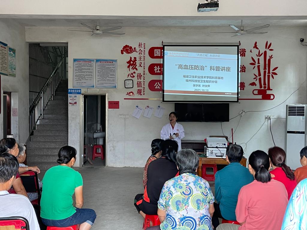 為充分發(fā)揮黨員的先鋒模范作用,普及慢病知識,提高基層群眾對慢病的管理能力,2021年10月13日,醫(yī)學(xué)系第三黨支部黨員教師葉汝萍隨閩侯縣科協(xié)一行赴閩侯縣小箬鄉(xiāng)湖柄村開展“高血壓病防治”科普講座。