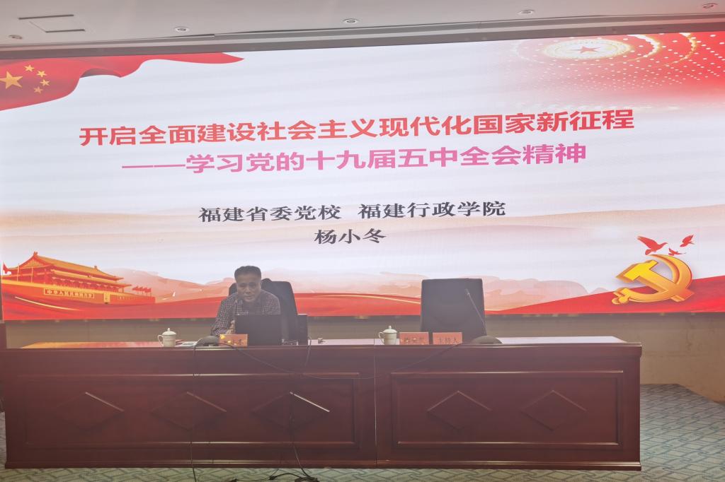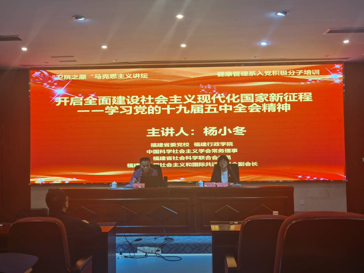 為深入學習領會習近平新時代中國特色社會主義思想和黨的十九屆五中全會精神,深刻認識我國當前社會發(fā)展新階段新特征,增強“四個意識”、堅定“四個自信”、做到“兩個維護”,2021年3月19日,福建省委黨校、福建行政學院楊小冬教授應邀為我校馬克思主義講壇開設《開啟全面建設社會主義現(xiàn)代化國家新征程——學習黨的十九屆五中全會精神》的專題講座。講座由馬克思主義學院院長熊美蘭主持,馬院全體思政課教師和健康管理系入黨積極分子參加了講座。