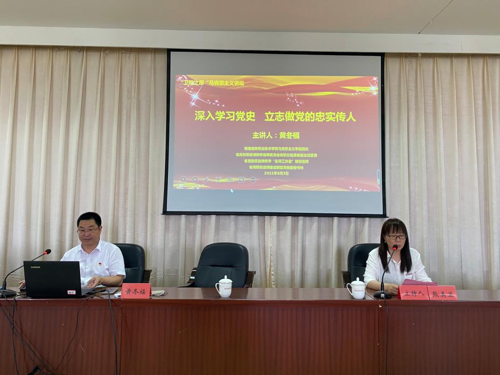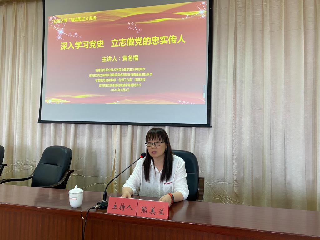 為深入學(xué)習(xí)貫徹落實習(xí)近平總書記在黨史學(xué)習(xí)教育動員大會上重要講話精神,貫徹落實省委部署的“再學(xué)習(xí)、再調(diào)研、再落實”活動,舉辦學(xué)黨史專題學(xué)習(xí),特別邀請福建信息職業(yè)技術(shù)學(xué)院馬克思主義學(xué)院院長黃冬福于2021年6月3日來我校開展《深入學(xué)習(xí)黨史 立志做黨的忠實傳人》的專題宣講。講座由我校馬克思主義學(xué)院院長熊美蘭主持,百余名師生參與講座。