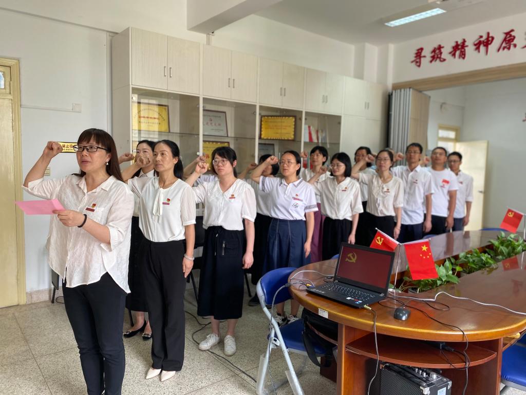 直播結(jié)束后,在莊嚴的《國際歌》聲中,全體教師黨員矗立在黨旗前,在熊美蘭同志的帶領(lǐng)下重溫入黨誓詞。