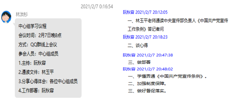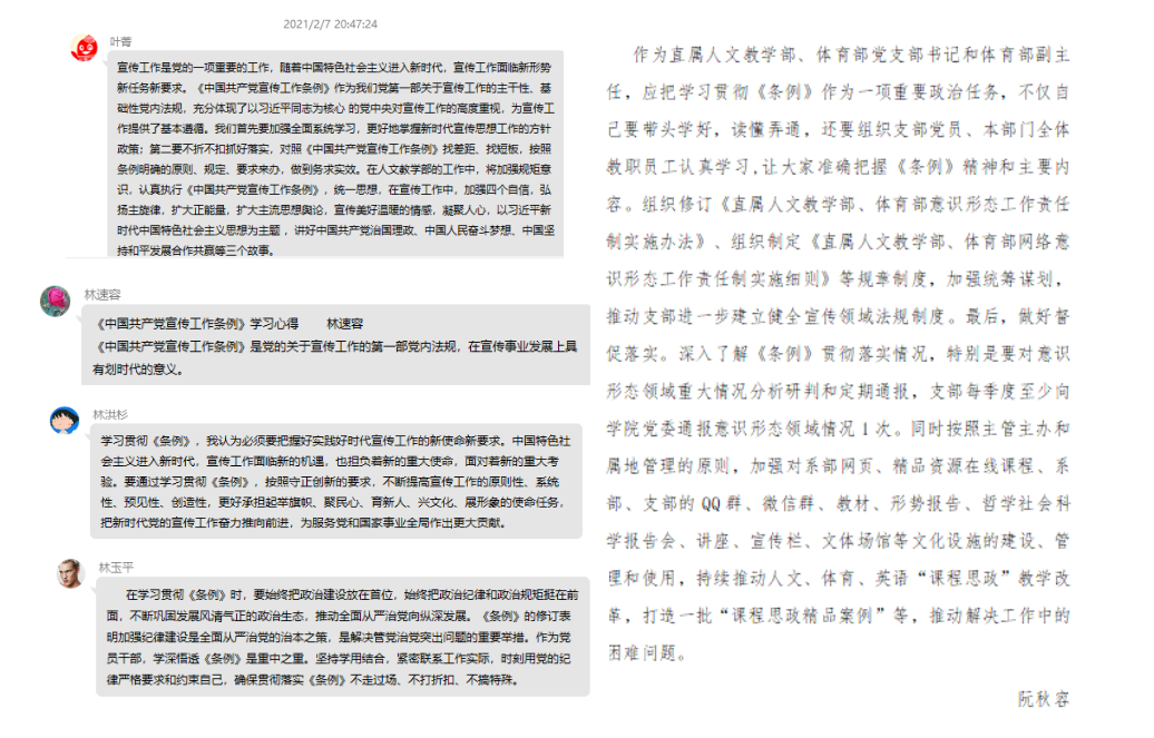 2月7日晚上,直屬人文教學(xué)部和體育部黨支部線上召開中心組學(xué)習(xí)(擴大)會議,專題組織學(xué)習(xí)《中國共產(chǎn)黨宣傳工作條例》(以下簡稱《條例》)和傳達全國宣傳部長會議精神,會議由直屬人文教學(xué)部和體育部黨支部書記阮秋容同志主持,人文教學(xué)部和體育部領(lǐng)導(dǎo)班子、直屬黨支部支委委員、系辦人員等參加了會議。