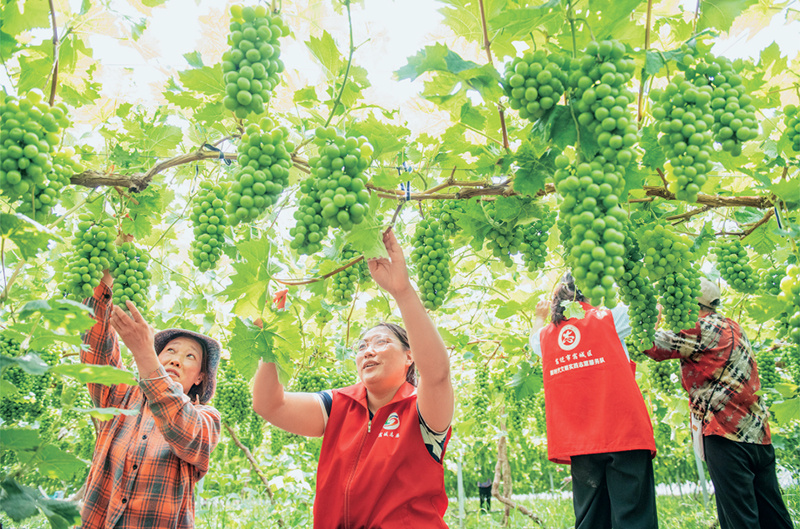 近年來,江蘇省宿遷市宿城區(qū)支口街道大力實(shí)施黨建引領(lǐng)強(qiáng)村富民工程,采取“黨建+合作社+農(nóng)戶”運(yùn)作模式,組織黨員志愿者走進(jìn)田間地頭生產(chǎn)一線,引導(dǎo)群眾因地制宜發(fā)展山楂、葡萄等特色產(chǎn)業(yè)種植,拓寬增收渠道,助力鄉(xiāng)村振興。圖為2023年6月30日,在宿遷市宿城區(qū)支口街道探楚社區(qū)葡萄種植基地,黨員志愿者和果農(nóng)一起管護(hù)葡萄。人民圖片 徐江海/攝