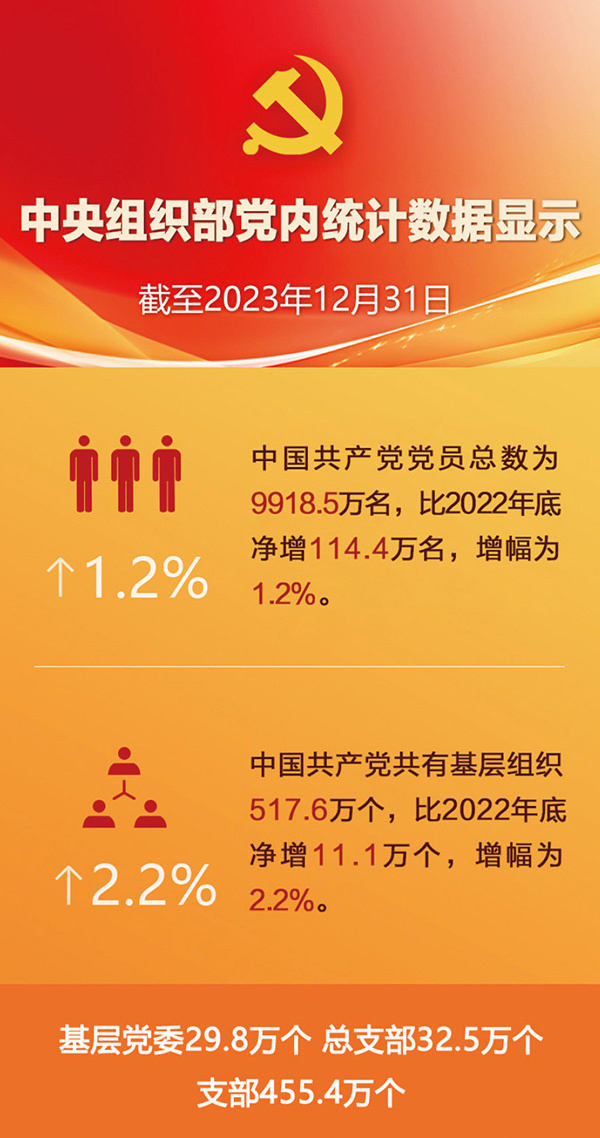 中央組織部2024年6月黨內統(tǒng)計數(shù)據(jù)顯示:截至2023年底,中國共產黨黨員總數(shù)為9918.5萬名,比上年凈增114.4萬名。黨的基層組織517.6萬個,比上年凈增11.1萬個。中國共產黨堅持大抓基層的鮮明導向,持續(xù)強基固本、補齊短板弱項,不斷嚴密上下貫通、執(zhí)行有力的組織體系,全面加強黨員隊伍建設,充分發(fā)揮基層黨組織戰(zhàn)斗堡壘作用和黨員先鋒模范作用,使黨始終保持旺盛生命力和強大戰(zhàn)斗力。推進黨的創(chuàng)新理論武裝,不斷健全固本培元、凝心鑄魂的教育體系。理論武裝是健全全面從嚴治黨體系的基礎工程。堅持不懈用習近平新時代中國特色社會主義思想凝心鑄魂、強基固本,健全常態(tài)化培訓特別是基本培訓機制,把學習黨的創(chuàng)新理論作為黨員干部教育培訓的主課、必修課,貫穿理論教育、黨性教育和履職能力培訓全過程各方面,教育引導廣大黨員干部學好馬克思主義看家本領,自覺做習近平新時代中國特色社會主義思想的堅定信仰者和忠實實踐者。增強教育培訓的系統(tǒng)性、針對性、有效性,不斷創(chuàng)新理論武裝的方式方法,堅持經常性教育和集中性教育相結合、理論武裝和實踐運用相結合、強黨性和增本領相結合,健全落實以學鑄魂、以學增智、以學正風、以學促干長效機制。加強對全面從嚴治黨的研究,加深對新時代黨的建設規(guī)律的認識,加強“中共黨史黨建學”學科體系、學術體系、話語體系建設。弘揚理論聯(lián)系實際的優(yōu)良學風,注重看以知促行、學用結合的成效,把黨的創(chuàng)新理論轉化為堅定理想信念、強大精神動力和出色工作業(yè)績。