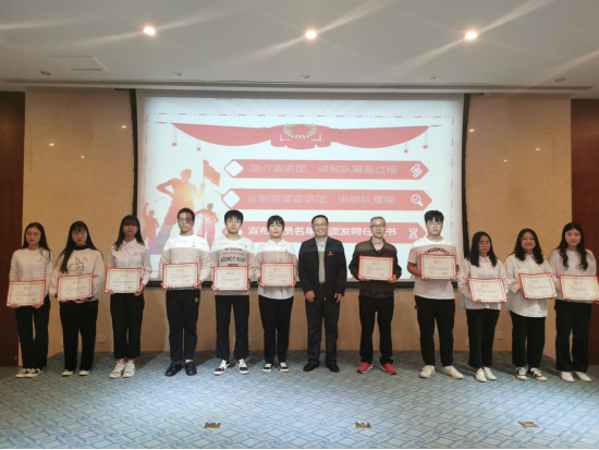 最后,校黨委書(shū)記曾武祈分別為宣講團(tuán)成員頒發(fā)聘書(shū),他強(qiáng)調(diào)宣講團(tuán)的成立將進(jìn)一步推動(dòng)我校習(xí)近平新時(shí)代中國(guó)特色社會(huì)主義思想的學(xué)習(xí)與宣傳,意義重大,希望同學(xué)們能夠更進(jìn)一步深入基層了解我們的黨情、國(guó)情、社情,堅(jiān)定信仰、錘煉意志、增長(zhǎng)見(jiàn)識(shí)、學(xué)好本領(lǐng),做好宣傳工作,更好地奉獻(xiàn)才干、服務(wù)社會(huì)。