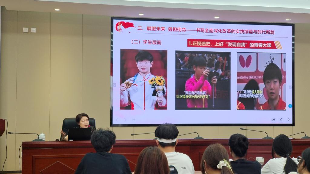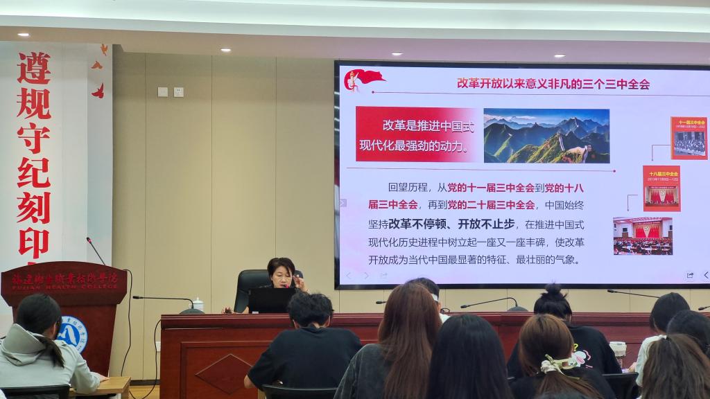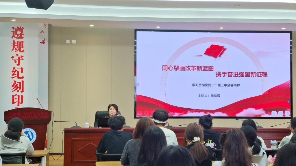 9月13日下午,校黨委委員朱扶蓉以“同心擘畫改革新藍(lán)圖 攜手奮進(jìn)強(qiáng)國(guó)新征程”為題,走進(jìn)24護(hù)理307、308班為我校師生專題宣講黨的二十屆三中全會(huì)精神暨秋季開(kāi)學(xué)第一課。