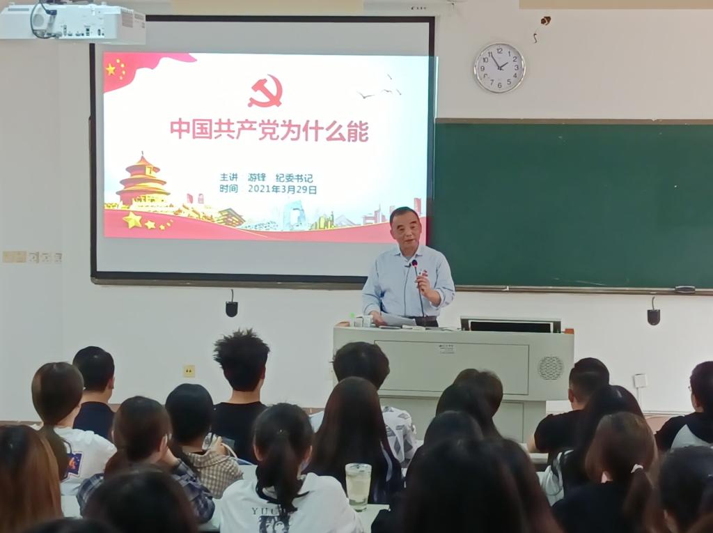 2021年3月29號,我校紀委書記游鋒以“中國共產(chǎn)黨為什么能”為主題,在教學(xué)樓110教室給20級藥學(xué)301、302班的學(xué)生開展一場別開生面的“開學(xué)第一課”,通過深入淺出的講述,加深了學(xué)生們對黨史的理解和感悟。