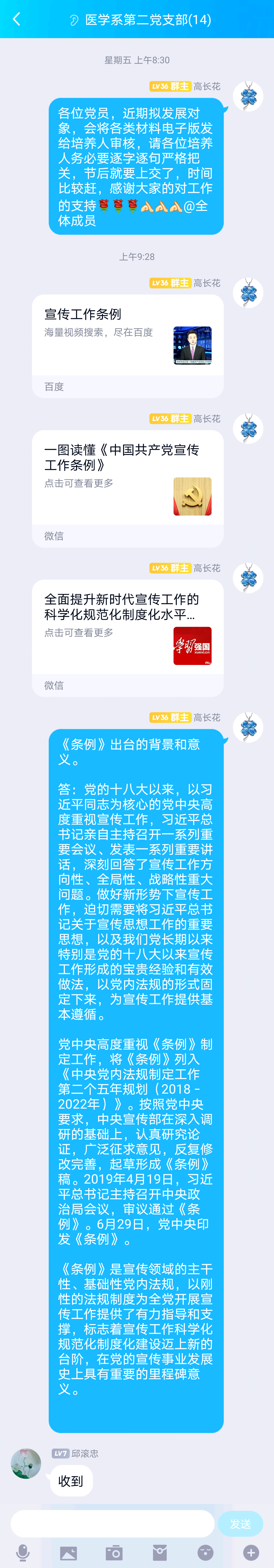 為提高全體黨員的政治意識(shí)和宣傳工作水平,2月8日上午,醫(yī)學(xué)系第二黨支部組織全體黨員在線專題學(xué)習(xí)了《中國(guó)共產(chǎn)黨宣傳工作條例》(以下簡(jiǎn)稱《條例》),學(xué)習(xí)活動(dòng)由支部書記高長(zhǎng)花同志主持。