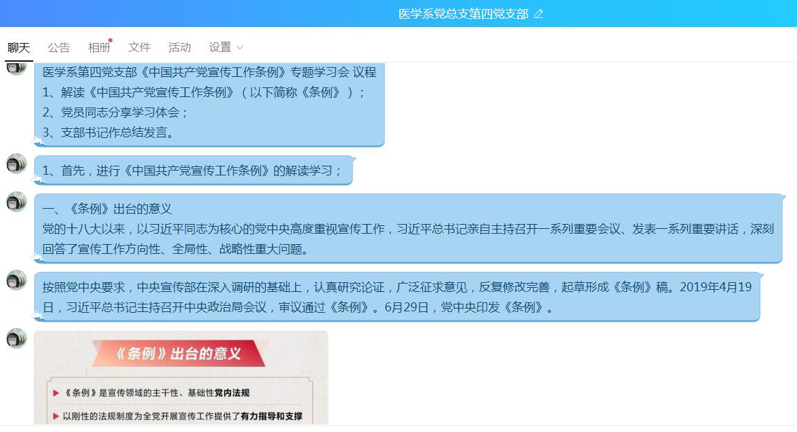 為提高全體黨員的政治意識(shí)和宣傳工作水平,2021年2月5日下午,醫(yī)學(xué)系第四黨支部組織全體黨員在線專題學(xué)習(xí)了《中國(guó)共產(chǎn)黨宣傳工作條例》(以下簡(jiǎn)稱《條例》),學(xué)習(xí)活動(dòng)由醫(yī)學(xué)系第四黨支部副書(shū)記修麗莉主持。