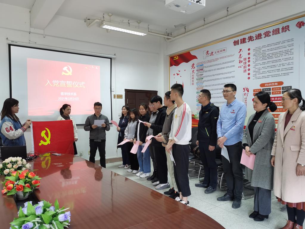 2021年3月24日,醫(yī)學(xué)技術(shù)系黨總支于系部會(huì)議室301舉行新黨員入黨宣誓儀式。系黨總支書記陳俊穎、副書記林燕、黨總支委員及黨支部書記、新黨員參加了儀式。儀式由學(xué)生黨支部書記曾慶才同志主持。