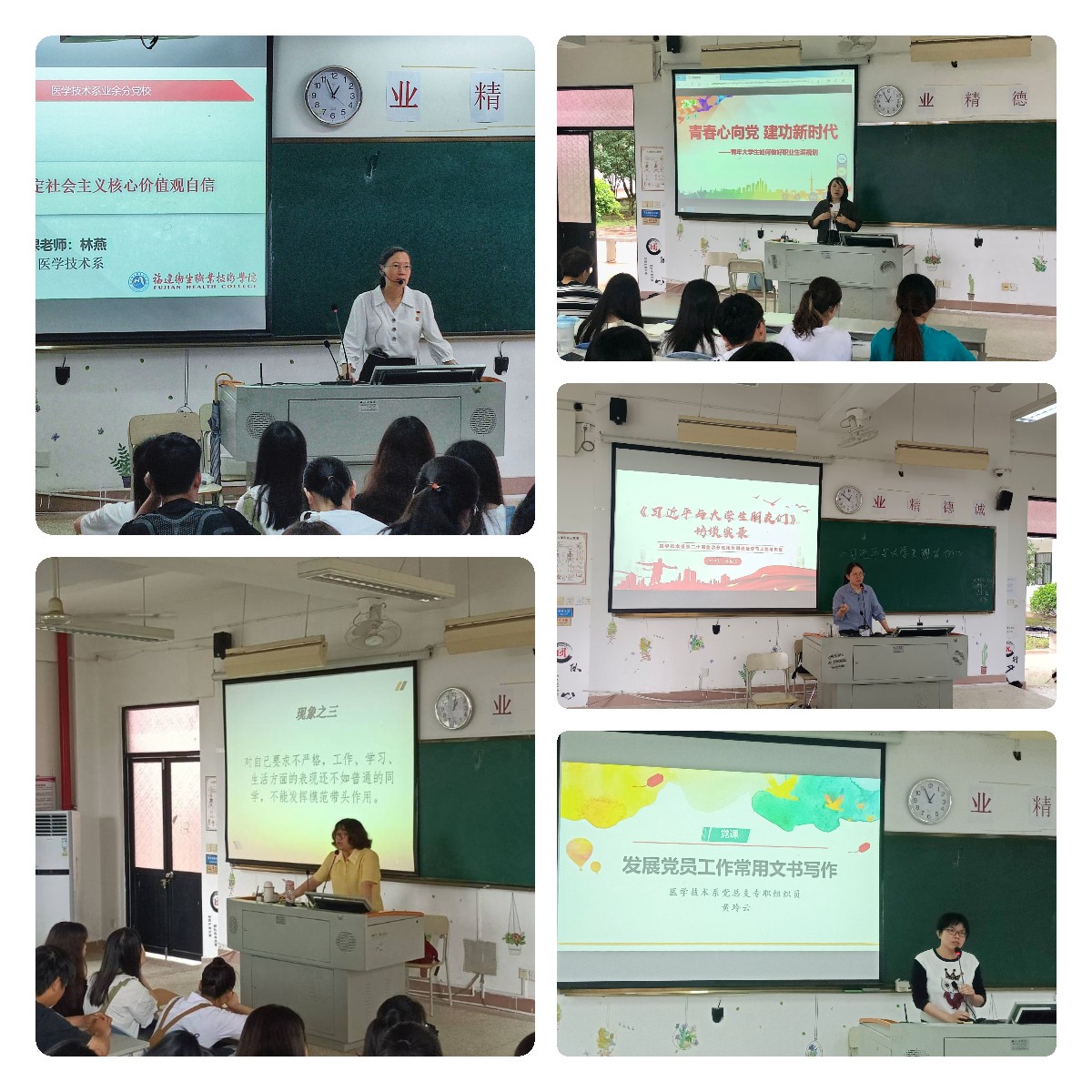 醫(yī)學技術(shù)系黨總支副書記林燕圍繞社會主義核心價值觀為學員們上黨課,她強調(diào)新時代大學生要重視社會主義核心價值觀的培育,爭做社會主義核心價值觀模范踐行者;黨總支委員陳念文圍繞“怎樣成為一名合格的大學生黨員”主題,站在學生視角,詳細剖析新時代學生黨員的要求;學生第一黨支部書記龍梅梅以《青春心向黨,建功新時代》為題,結(jié)合職業(yè)發(fā)展規(guī)劃和就業(yè)指導,引導學員們腳踏實地、以行動入黨;學生第二黨支部書記蔣程序領(lǐng)學《習近平與大學生朋友們》,引導學員們深入感受到人民領(lǐng)袖對青年一代的親切關(guān)懷和殷切期望,堅定做一名新時代有志有為青年的信念;黨總支專職組織員黃玲云開展發(fā)展黨員工作常用文書寫作指導,引導學員們及時向黨組織匯報思想動態(tài),積極接受黨組織和培養(yǎng)人的指導意見。