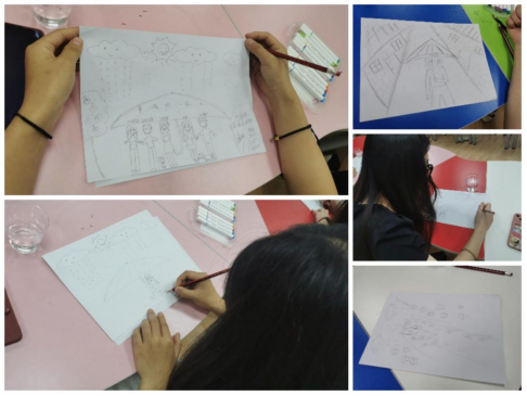 在“雨中人”主題繪畫環(huán)節(jié),同學(xué)們在白紙上根據(jù)要求自由發(fā)揮,并涂上顏色。隨后雪梅老師一一為大家解讀了畫的寓意,如雨滴的大小代表壓力的大小,傘、屋檐等保護物其實就是自己感知到的面對壓力的支持力量,她還就畫的布局分析了同學(xué)們的性格和處事方式。