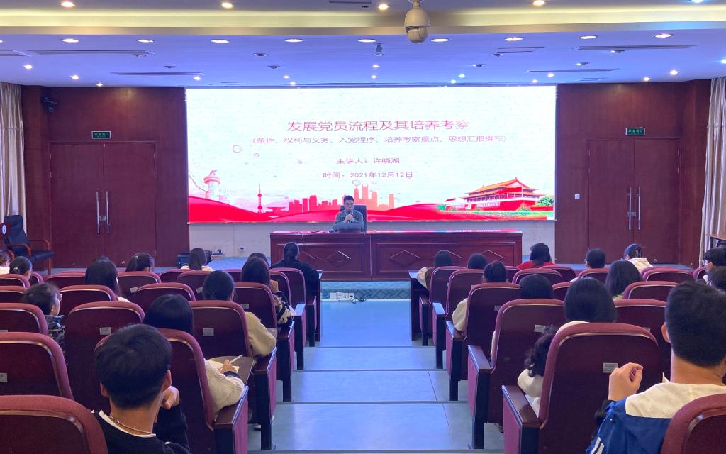 為使入黨積極分子更加了解中國(guó)共產(chǎn)黨黨員發(fā)展流程及其培養(yǎng)考察的內(nèi)容,20211212日晚上健康管理系業(yè)余分黨校第八期培訓(xùn)班暨青馬工程培訓(xùn)班第二課在實(shí)訓(xùn)樓四樓報(bào)告廳舉行。本次授課由健康管理系專(zhuān)職組織員許曉湖主講,為同學(xué)們帶來(lái)了一次精彩生動(dòng)的黨課。
