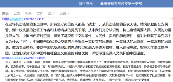 2022年4月9日上午,健康管理系黨總支第一支部組織全體黨員學習收看“同上一堂疫情防控思政大課”。黃秀玲、石紅梅、陳韻、董海峰、陳東五位教授分別為我們帶來了生動、精彩的一課。