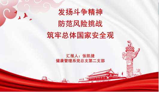 為了響應(yīng)全民國家安全教育日號(hào)召,切實(shí)提高政治站位,全面貫徹總體國家安全觀,進(jìn)一步推動(dòng)總體國家安全觀入腦入心,形成國家安全教育的良好局面。健康管理系黨總支第二支部于5月6日在學(xué)生服務(wù)中心會(huì)議室召開“發(fā)揚(yáng)斗爭(zhēng)精神,防范風(fēng)險(xiǎn)挑戰(zhàn),筑牢總體國家安全觀”主題黨課。本次黨課由健康管理系黨總支第二支部書記張凱捷主持,支部學(xué)生黨員代表參加會(huì)議。